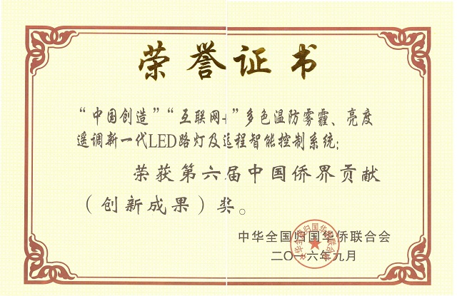 我司研發(fā)制造的“中國創(chuàng )造”“互聯(lián)網(wǎng)+”多色溫防霧霾、亮度遙調新一代LED路燈及遠程智能控制系統于2016年9月榮獲第六屆中國僑界貢獻(創(chuàng )新成果)獎。