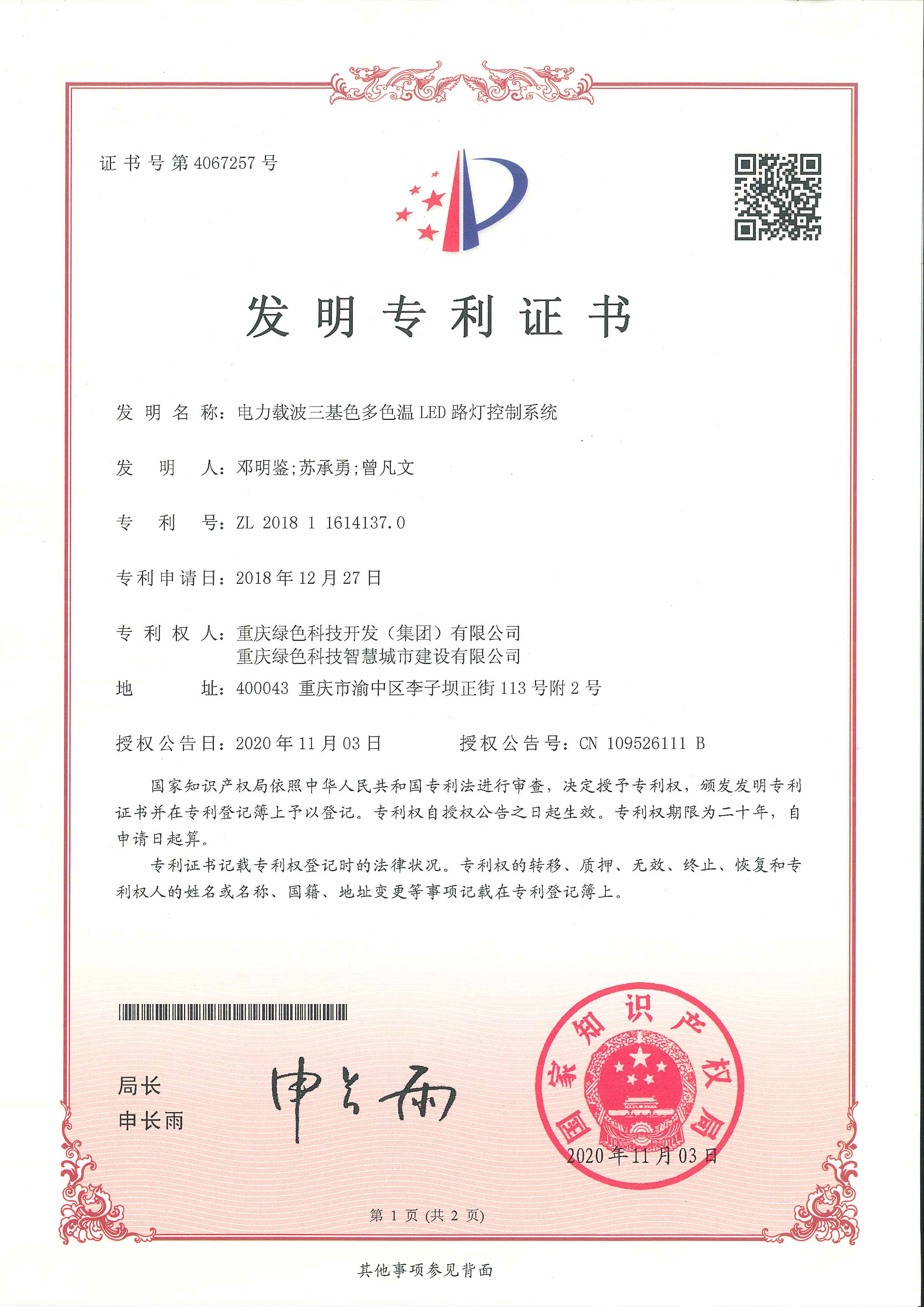 《電力載波三基色多色溫LED路燈控制系統》(專(zhuān)利號:ZL 2018 1 1614137.0)